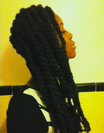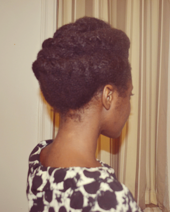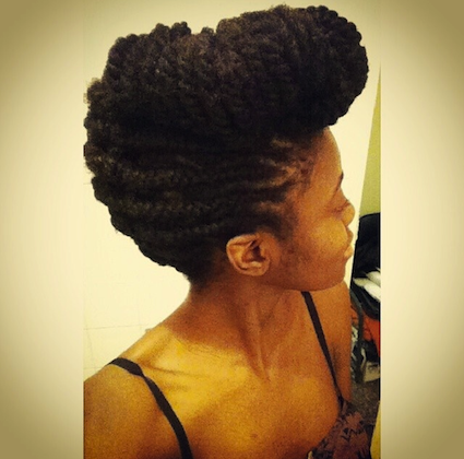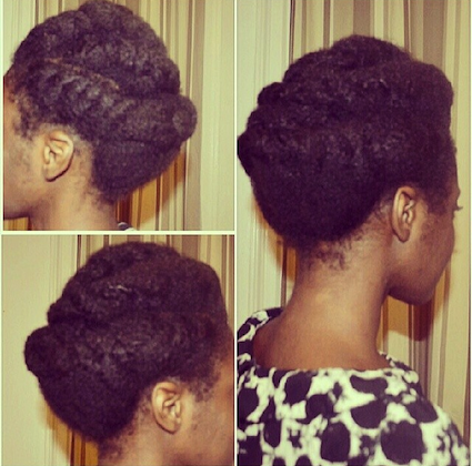A: I wear my hair in some form of low maintenance or protective style about 90% of the time. This usually consists of simple updos, flat twists, or different styles with two strand twists. I rarely wear my hair out during the week. Over the weekend, I let the fro out! I moisturize my hair twice daily using my spritz of water, aloe vera juice and glycerin. During the winter months, I do a lot of low tension long-term protective styling, such as flat twists with Havana hair just to keep my hair protected from the drying effects of the cold weather. I keep the protective styles in for 3-4 weeks at a time and take 2 week breaks in between. My goal is to find/create cute protective styles that I can keep in for 2-3 weeks that I can do myself (ideally without any extension hair).