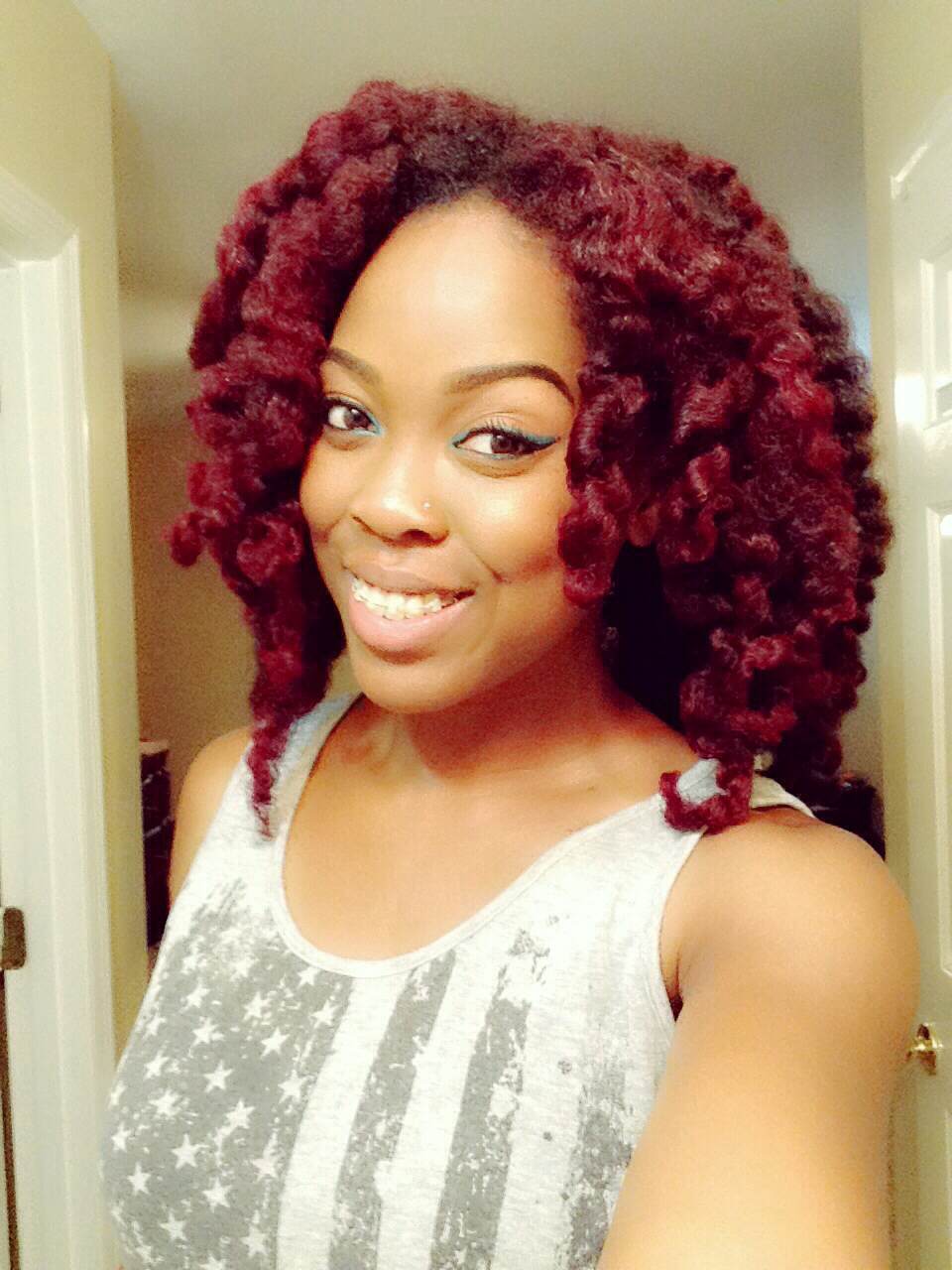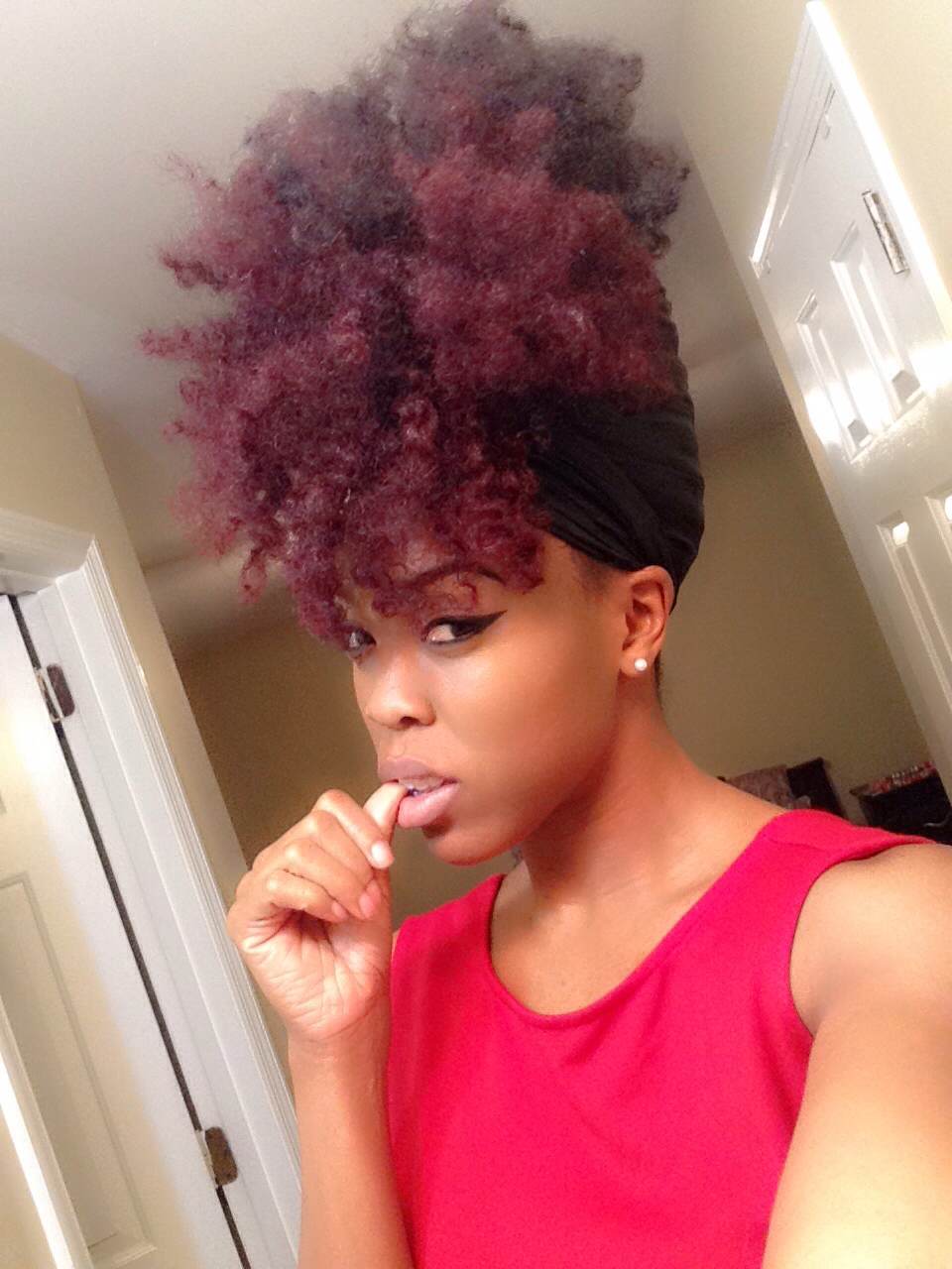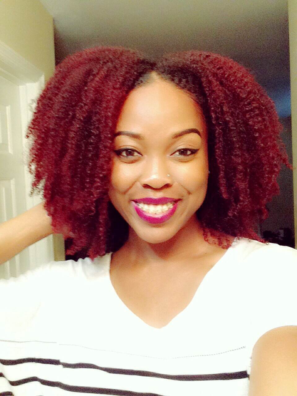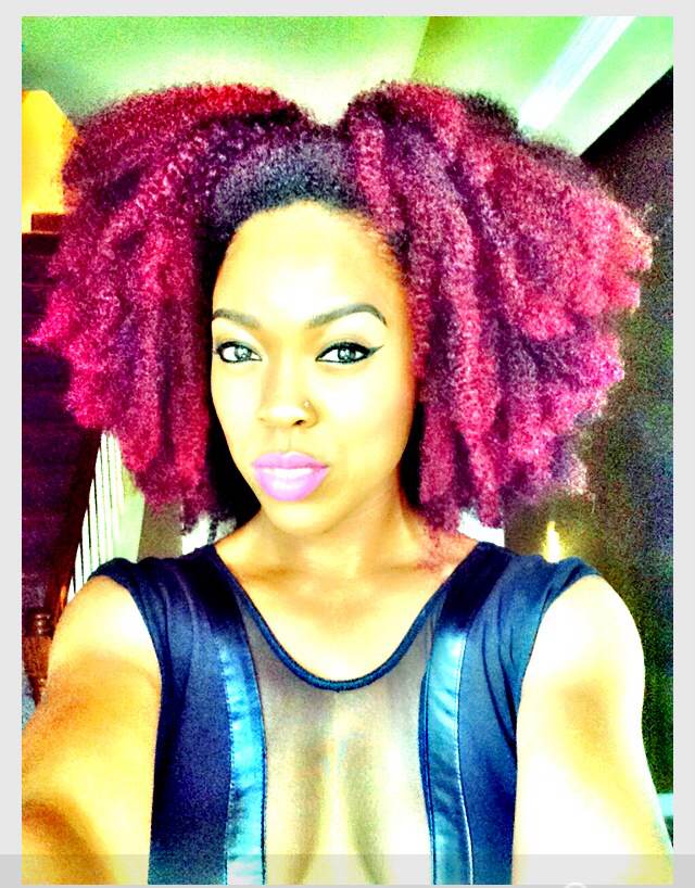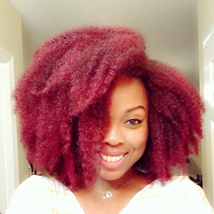 A: My hair color is half and half at the moment. It is red in the front, and my natural color, dark brown, in the back. I do color my own hair with the L’Oreal HiColor Hilights in Magenta and Red. I haven’t seen much change in texture, but it has changed a little. The front of my head has always been a looser texture than the back, so adding the color did loosen it a bit more. But overall, my hair hasn’t really suffered from coloring.