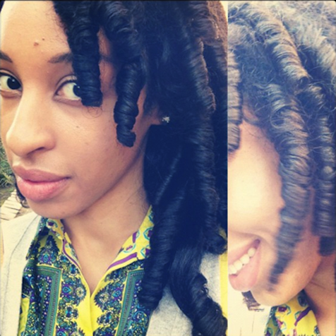 At night to preserve my curls I use the “pineapple” method and tie my hair up into a high ponytail then wrap it with a silk scarf. Every day I apply some type of moisturizer/refresher. To refresh daily I use Carol’s Daughter Hair Balm, Miss Jessie’s Baby Buttercreme, or simply a spray bottle with ¾ cold water and ¼ aloe vera juice. Twisting and roller setting allows my hair to have a break from wash n’ gos. Twisting is great because it keeps my ends protected for a week at a time and the roller sets allow me to achieve a straighter look without the flat irons and blow dryers. To roller set I use very small rollers with caps that go over them. I make sure to make the parts very small so they dry neatly. My favorite product for the sets is Redken’s Smooth Down Butter Treat and for twists Miss Jessie’s Curly Meringue.