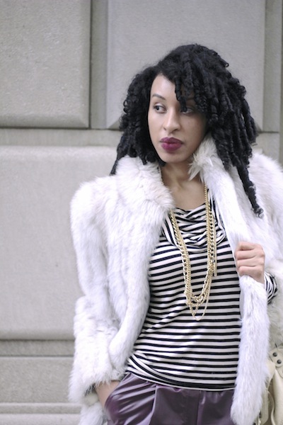 At night to preserve my curls I use the “pineapple” method and tie my hair up into a high ponytail then wrap it with a silk scarf. Every day I apply some type of moisturizer/refresher. To refresh daily I use Carol’s Daughter Hair Balm, Miss Jessie’s Baby Buttercreme, or simply a spray bottle with ¾ cold water and ¼ aloe vera juice. Twisting and roller setting allows my hair to have a break from wash n’ gos. Twisting is great because it keeps my ends protected for a week at a time and the roller sets allow me to achieve a straighter look without the flat irons and blow dryers. To roller set I use very small rollers with caps that go over them. I make sure to make the parts very small so they dry neatly. My favorite product for the sets is Redken’s Smooth Down Butter Treat and for twists Miss Jessie’s Curly Meringue.