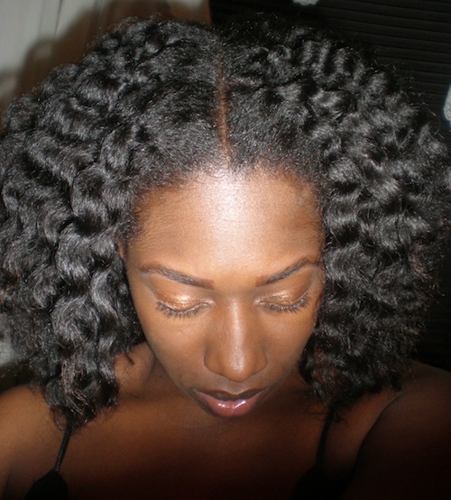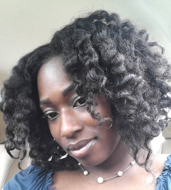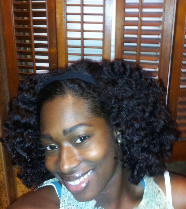 A: I shampoo weekly in four sections with Organix Coconut Milk Sulfate-Free Shampoo, then deep condition under my Huetiful Hair Steamer. Currently I am using Aubrey Honeysuckle Rose Moisturizing Conditioner (I keep Suave Humectant Moisture Conditioner, Giovanni or Trader Joe’s Tea Tree Conditioner, and Aussie Moist in the mix as well– it all depends on what my hair is in need of). I then rinse and detangle in sections directly under the water stream using a shower comb. Afterwards, I apply Infusium and Giovanni’s Direct Leave In, and wrap it up in a microfiber towel to rid it of the drippies. Then I allow it to air dry in two twisted low ponytails or in Curlformers. Both methods provide me with stretched hair. Then before I go to bed I set it in twists or braids for a big fluffy set.