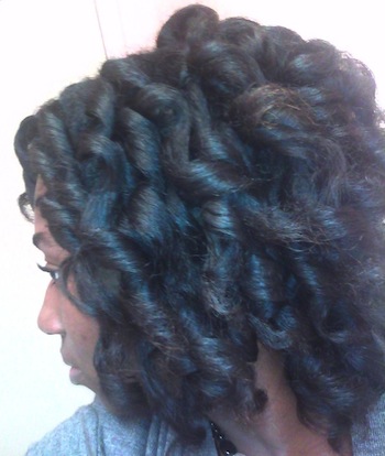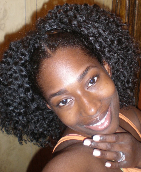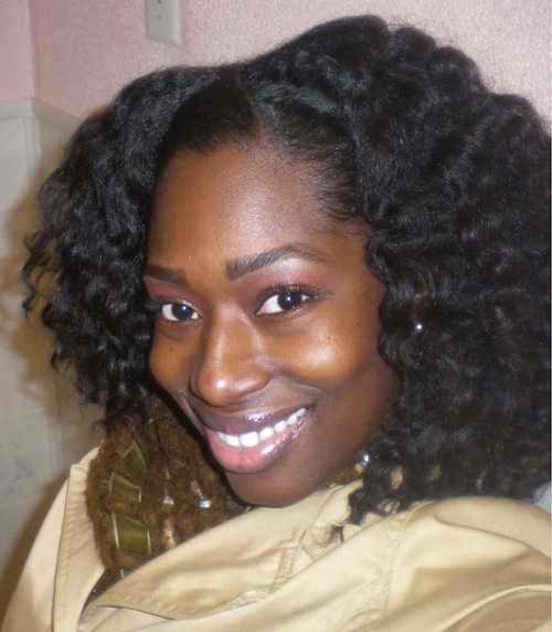 A: I shampoo weekly in four sections with Organix Coconut Milk Sulfate-Free Shampoo, then deep condition under my Huetiful Hair Steamer. Currently I am using Aubrey Honeysuckle Rose Moisturizing Conditioner (I keep Suave Humectant Moisture Conditioner, Giovanni or Trader Joe’s Tea Tree Conditioner, and Aussie Moist in the mix as well– it all depends on what my hair is in need of). I then rinse and detangle in sections directly under the water stream using a shower comb. Afterwards, I apply Infusium and Giovanni’s Direct Leave In, and wrap it up in a microfiber towel to rid it of the drippies. Then I allow it to air dry in two twisted low ponytails or in Curlformers. Both methods provide me with stretched hair. Then before I go to bed I set it in twists or braids for a big fluffy set.