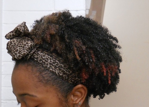 A: Throughout the month my styling is all over the place. I wash it once a week, or once every two weeks. I wear it out a lot, but pin ups are my favorite too. I love my faux Bette Davis Bangs :). I have also been getting into mini twists and braids lately! I use coconut oil and shea butter mostly and R&B from Lush Cosmetics. I also make my own flax seed gel.