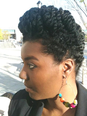 C: It’s difficult to use one month as representative of what I do to my hair overall. It depends on what kind of mood I’m in and the weather outside. My general goal is 50% in protective styles and 50% “free” styles. I love funky updos as well as wigs for protective styles in the winter months (or when I just need a break). I also love every “out” that you can think of (example: twist out, braid out, bantu-knot out, perm rod sets, etc). My “go to” styling products include ORS Lock & Twist Gel (for all of my “out” styles), Tresemme Naturals Conditioner (as a leave-in on wash & go days), Eco Styler Gel (for my wash and go’s) and either Jamaican Black Castor Oil or Extra Virgin Olive Oil.