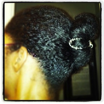 C: Every day, I spritz my hair with rain water and I apply Shea Moisture Organic Curl & Style Milk to moisturize my hair. I then proceed to style my hair in a bun secured with a Flexi-8 or hair stick. Occasionally (on the weekend), I spritz and fluff to wear my hair in a 2nd or 3rd day wash and go.