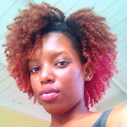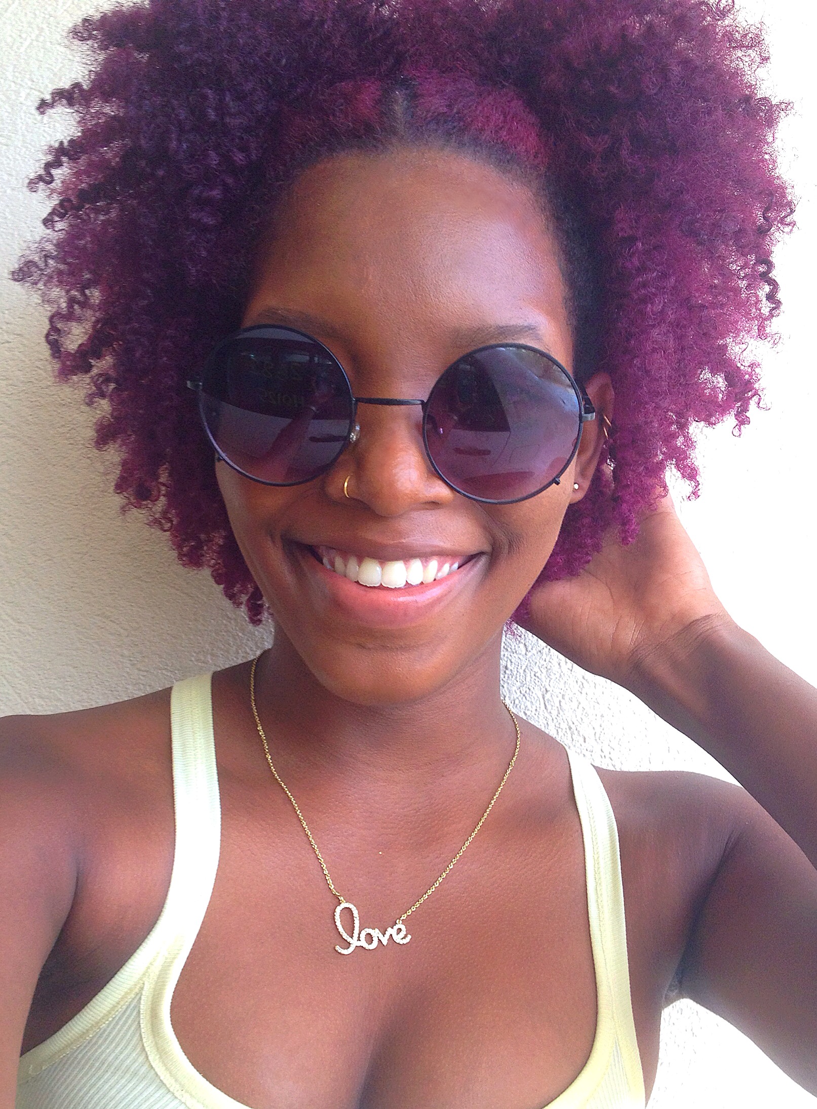 C: My hair colour at the moment is a mixture of a royal purple & a pinkish purple and it’s my favourite colour to date! I coloured it with the help of a friend this last time but I usually colour it myself. I used 20% developer mixed with bleach to lift my natural, jet black colour then used Adore’s Violet Gem & Purple Rage to get this colour. It hasn’t changed my hair texture at all but I find my hair gets drier quicker so I have to moisturize daily with water then olive oil or Design Essentials Natural Daily Moisturizing Lotion.