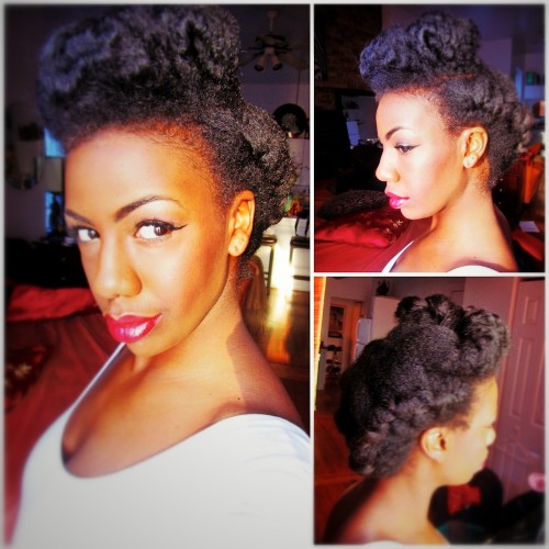 A tutorial is a great idea! The day before I had done a flat twist out (four large flat twists straight back) so my hair was already had a looser wave pattern to it. Then I just sectioned off the front to pin back an asymmetrical pompadour, did two flat twists on the sides and pinned the ends to the opposite side in the back.