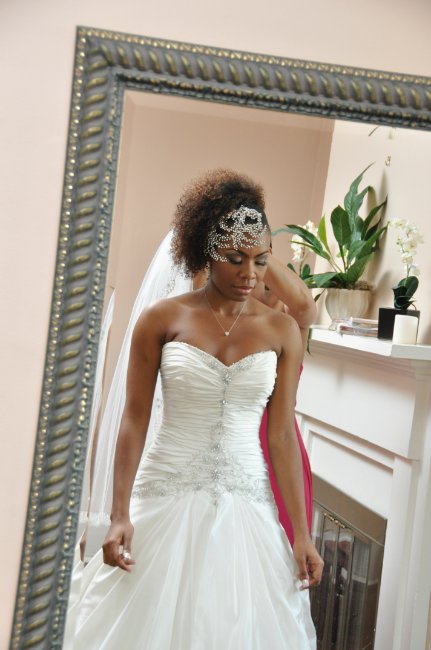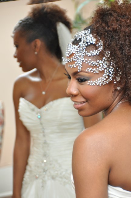 You look Absolutely stunning!! The head piece is very beautiful and has complimented your hair and dress beautifully.