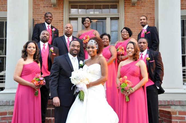 The weather was perfect and the venue decorated beautifully. I’m still getting rave reviews on the color combination (fuchsia and orange) which most people thought was horrible until they saw them together. Our venue did the catering and I’ve heard the food was great! I was too excited to eat that day. It was wonderful to have both of our families and friends come together to celebrate our union, and a day I shall cherish forever.