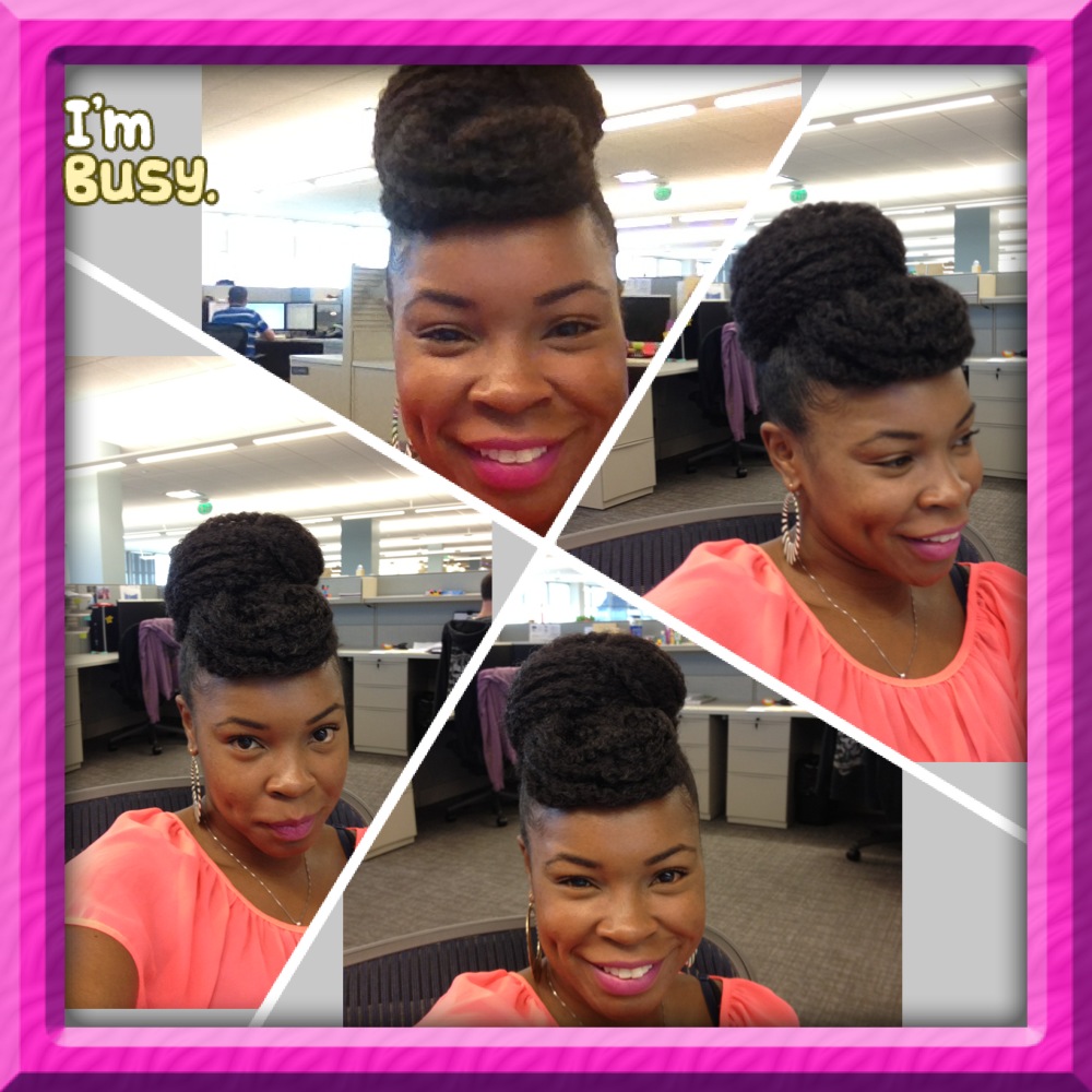 J: My Fav Go-to Style is a High Bun with big chunky earrings. I mist my hair with water, olive oil, and Glycerin Mix, Leave in conditioner Shea Moisture restorative conditioner and Eco Styler Gel. I secure it with a regular black shoe string and bobby pins. Sometimes I will even put the bun to the side of my head. What I love about buns are that they don’t have to be perfect.
