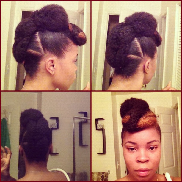 for the front bun style i sectioned out a bang in the front. i then stuffed my hair under a scarf and did like a big flat bantu knot in the front. i then took the bang and wrapped around the out side of the knot. it is very simple.