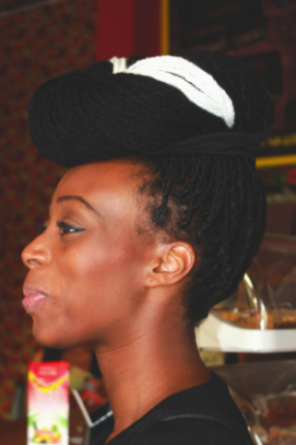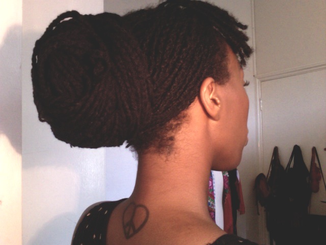 I wash my hair roughly every 10 days, apply a hot oil treatment and wrap it. Every 2 – 3 months I retwist the new growth. I only use a few products on my hair. I use Olive and Clove Oil Therapy by Organics, Aloe gel and Olive Oil Shampoo. In terms of styling I often wear up-dos or headwraps.
