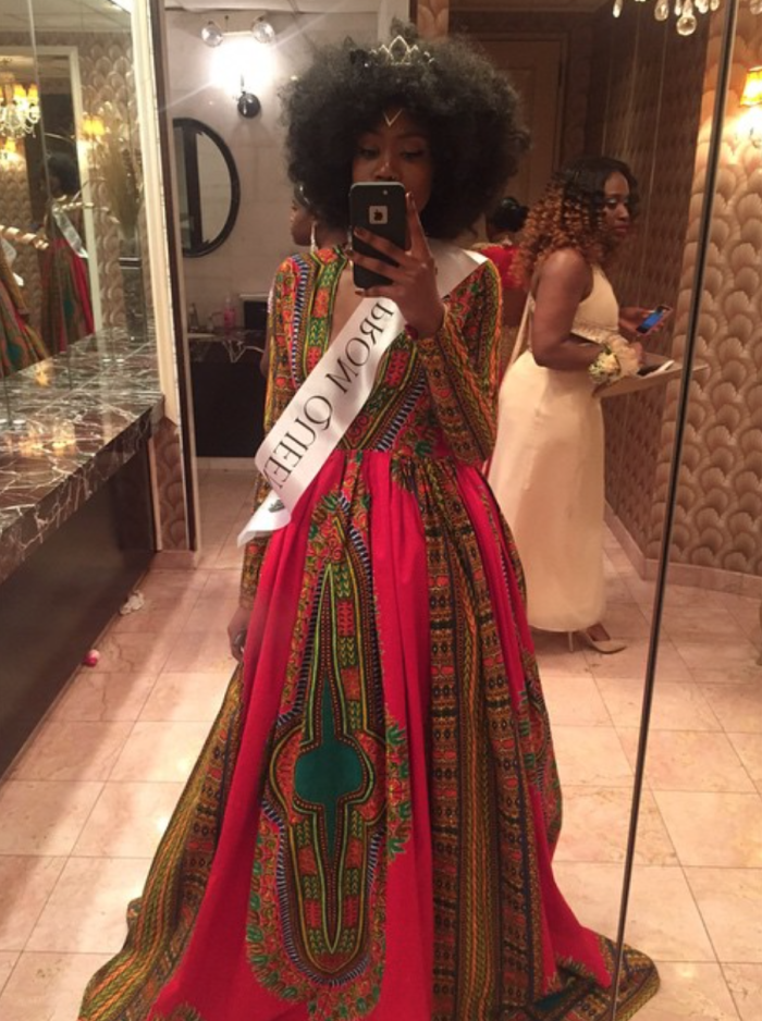 Kyemah designed the dress herself and wore it with a stunning afro and headpiece. And if you’re surprised at how gorgeous the gown is, you shouldn’t be. Kyemah has been accepted to the prestigious Parsons School of Design and will be attending in the Fall. She accompanied her photo with this caption;