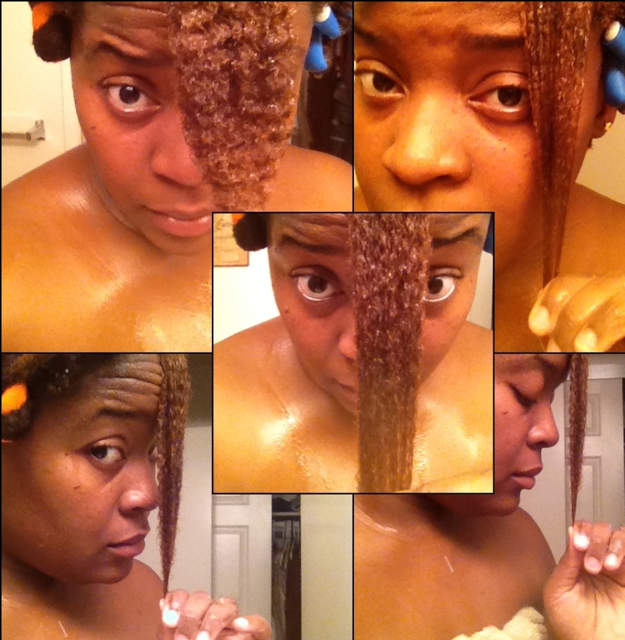 P: My hair absolutely loves protein (I attribute that to the protein structure loss from coloring) so when I’m preparing to wash with a shampoo I’ll mix up a quick little treatment I found on a Natural Hair Care app. It consists of mixing an egg or 2 (for thicker/longer hair…I only use the whites of one egg, those whites pack a heavy protein punch) apple cider vinegar, a couple of tablespoons of castor and olive oil whipped up for about 15 minutes. I apply the mixture to my hair focusing on my scalp and ends, then plop my hair up into a conditioning cap. After about an hour or 2 I’ll hop in the shower, section my hair off into 6 sections with banana clips and then proceed to rinse out the egg mixture with lukewarm water, and follow that up with my homemade Aloe and African Black Soap Shampoo.