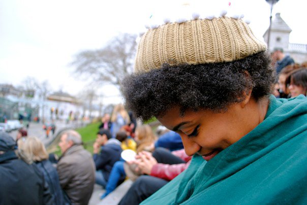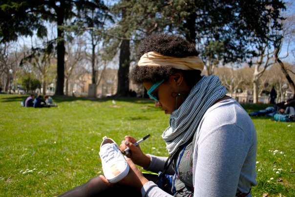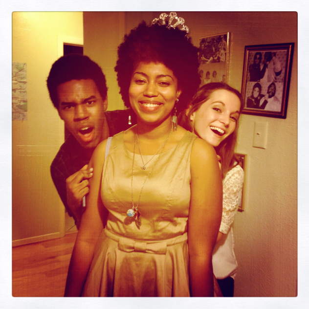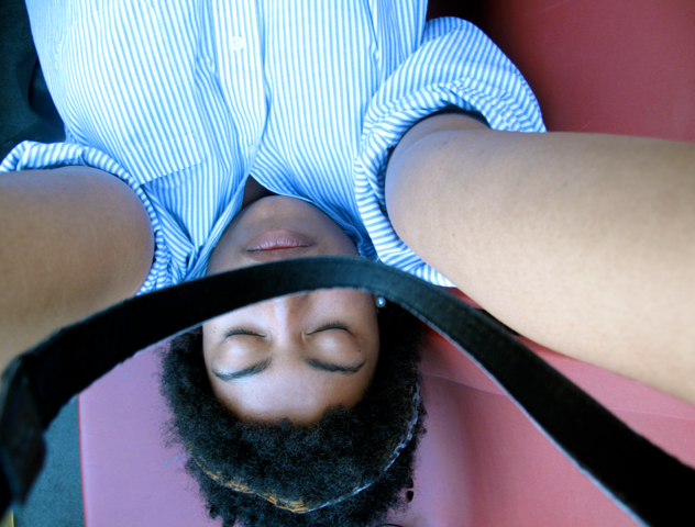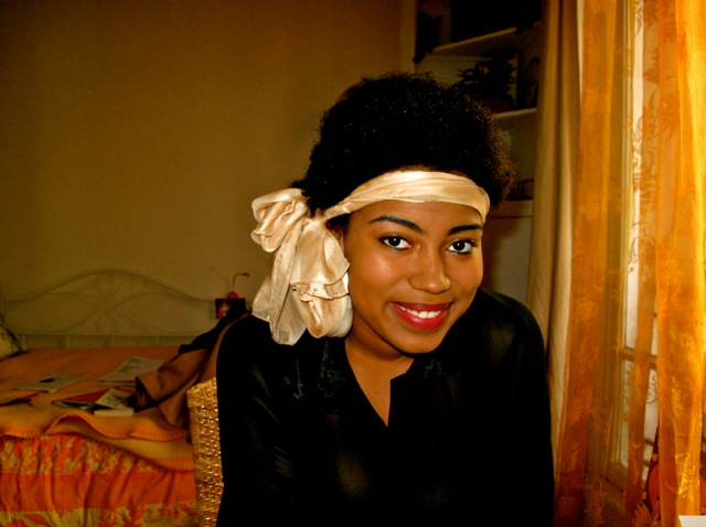 S: My regimen is all over the place. As a poor, busy college student my hair is lucky to be washed once a week. It’s usually every two weeks. I’ve used a lot of different shampoos, but I make sure they are all sulfate free. Walmart has an okay line of hair products called Organix. I like the Cherry Blossom Ginseng, because it smells delicious. After washing and conditioning I use Kinky Curly Knot Today to detangle, then I usually do twists, wrap and rock head wraps for a couple of days. I also love Karen’s Body Beautiful. I use their Sweet Ambrosia Moisturizer and Body Butter. They make my hair swoon with joy. I also have this shea butter/olive oil/jojoba oil contraption that I invented. I use it to add sheen and lock in moisture.