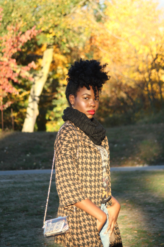T: I wash my hair with shampoo every three to four weeks. On wash day I part my hair into four sections and lightly damp each section with water. Then I mix conditioner of my choice with some honey, castor oil and olive oil to apply to my hair. I cover my hair with a plastic cap and wrap my head with a towel and let that sit for two hours. Once in the shower I wash my hair with Ouidad Ultra Nourishing Cleansing Oil. I use Kinky-Curly Knot Today in the shower to de-tangle and apple cider vinegar as a clarifying rinse. After I have washed and re-twisted each section in the shower I dry my hair with an old t-shirt and apply my products to damp hair. Most of the time I apply Oyin handmade hair dew. I retwist or braid my hair into smaller sections to dry and seal my ends with castor oil. The following day I grease my scalp with coconut oil. From then until wash day I try and keep my hair moisturized with water and water based products. My hair regimen changes depending on the needs of my hair as my hair grows. It is important to switch things up when necessary.