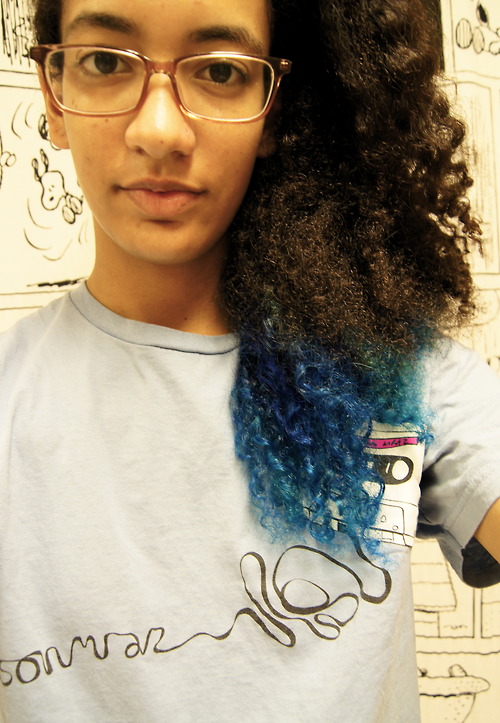 T: I have a basic hair regimen. Each day I comb my hair in the shower with a wide toothed comb, and then put in conditioner. I focus on the ends and the middle rather than the scalp and roots. With the conditioner in, I brush my hair with a paddle brush. I usually wrap my hair in a towel and do whatever else I have to do to get ready. I only shampoo once a week, sometimes less. I tend to go on the instinct of when my head gets too itchy. I actually don’t have any preferred products. I used Tresemme for a while. I just recently (as in a couple days ago) started using Shea Moisture products, and I have to say they smell delicious.