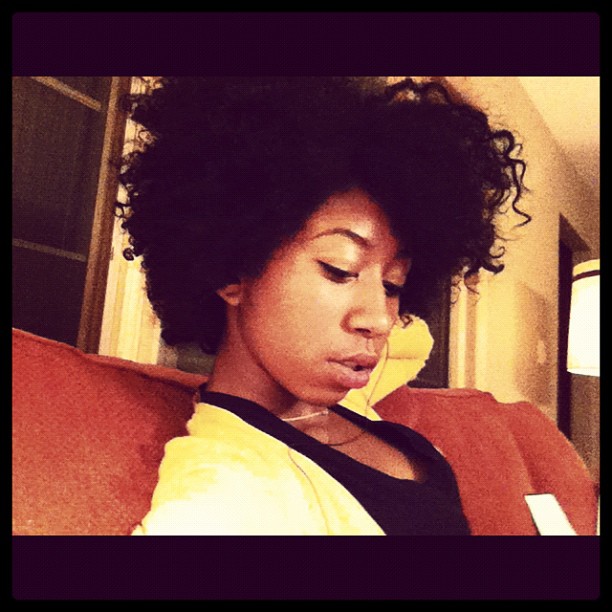 T: I’ve been natural for 3 years and I still don’t have a set regimen for my hair. I’m always trying out new techniques and products. I used to wear my hair in wash n go’s every day and rarely protected my strands at night. As my hair got longer and bigger, this ended up resulting in a lot of dryness, tangling, and single strand knots. Now I mostly wear my hair in twist-outs. I’ll use my conditioner (Giovanni) as a leave-in and maybe use a bit of gel (I use the cheap stuff at the drugstore!) Depending on the effect I want I will do anywhere from 6-20 twists total. For whatever reason, my curls don’t tend to hold up well after day 2, so I’ll usually retwist after a shower every other night or so. I’ve also begun pressing my hair straight on occasion to change things up.