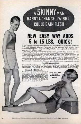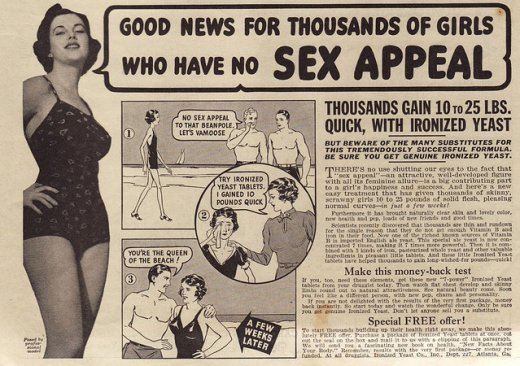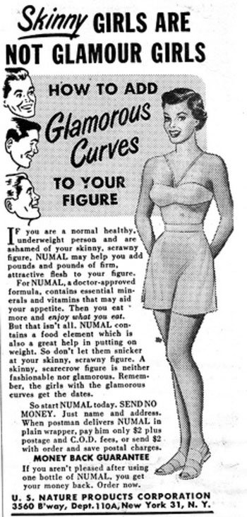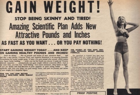 This ad isn’t promoting general weight gain. It’s euphemistically suggesting that if a girl uses their product, she’ll “gain weight” in one area: her BOOBS! Ads from back in the day were all about euphemisms.